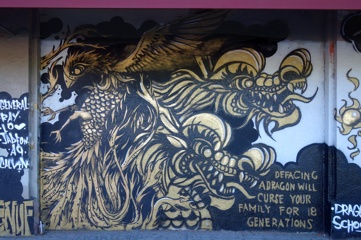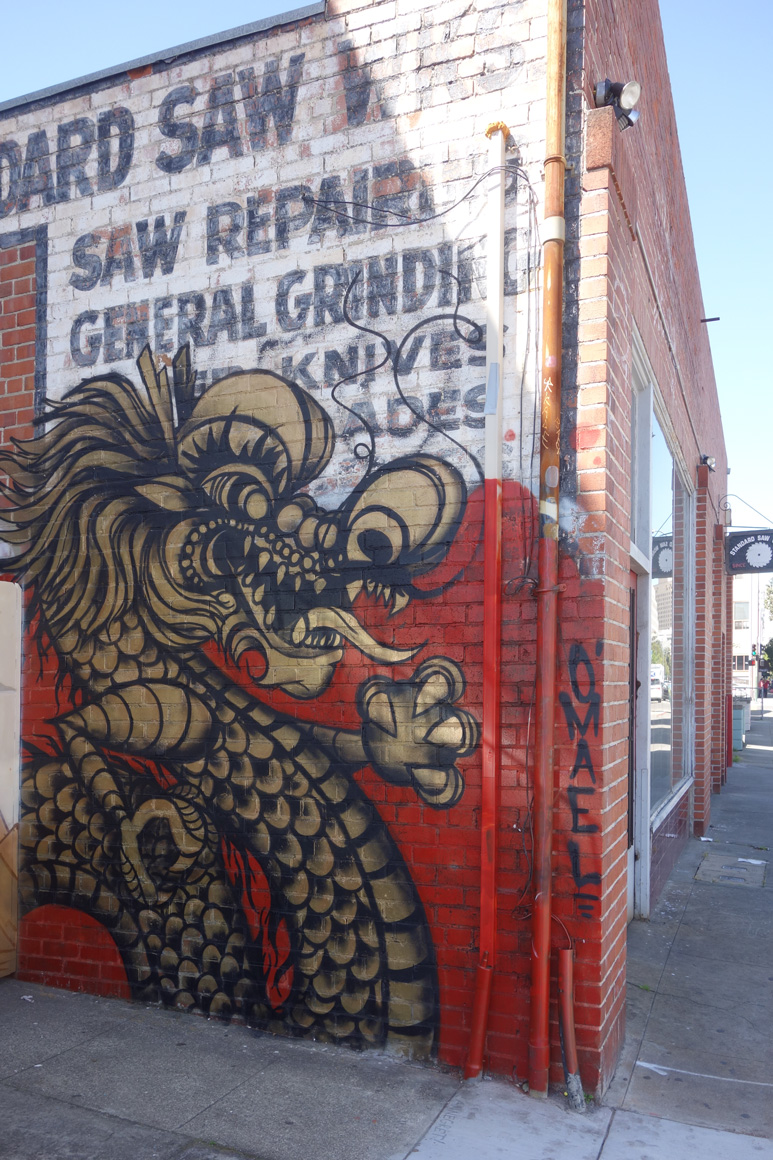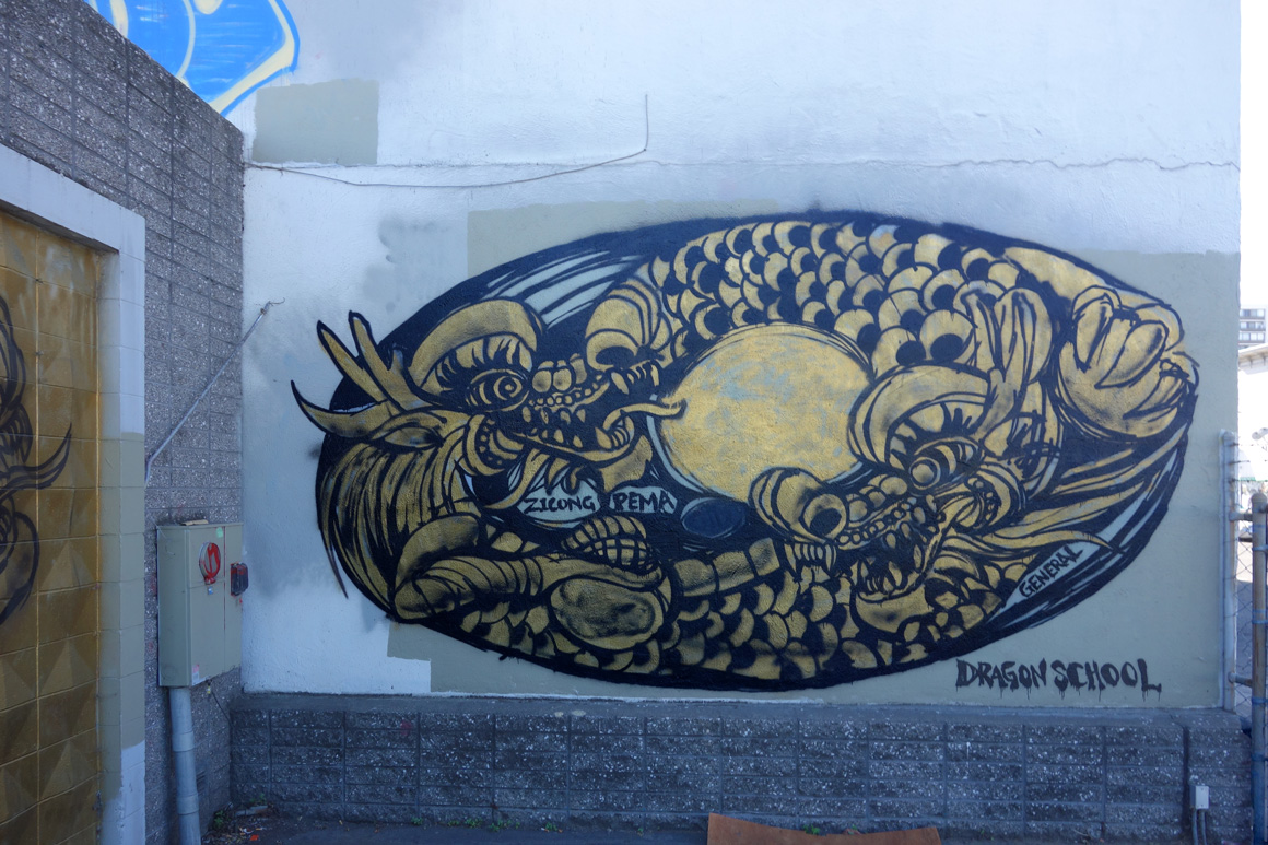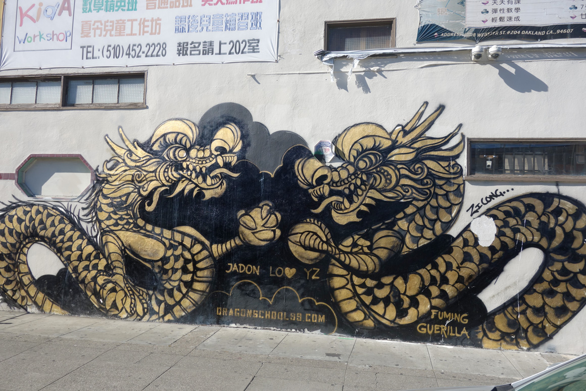 It is significant that the golden dragon raised its’ head in 2015 in Oakland Chinatown. During the course of the year it was painted on walls all around Chinatown making a bold statement by claiming the walls and elevating Chinatowns visibility simultaneously promoting pride in the culture and celebration of the arts.